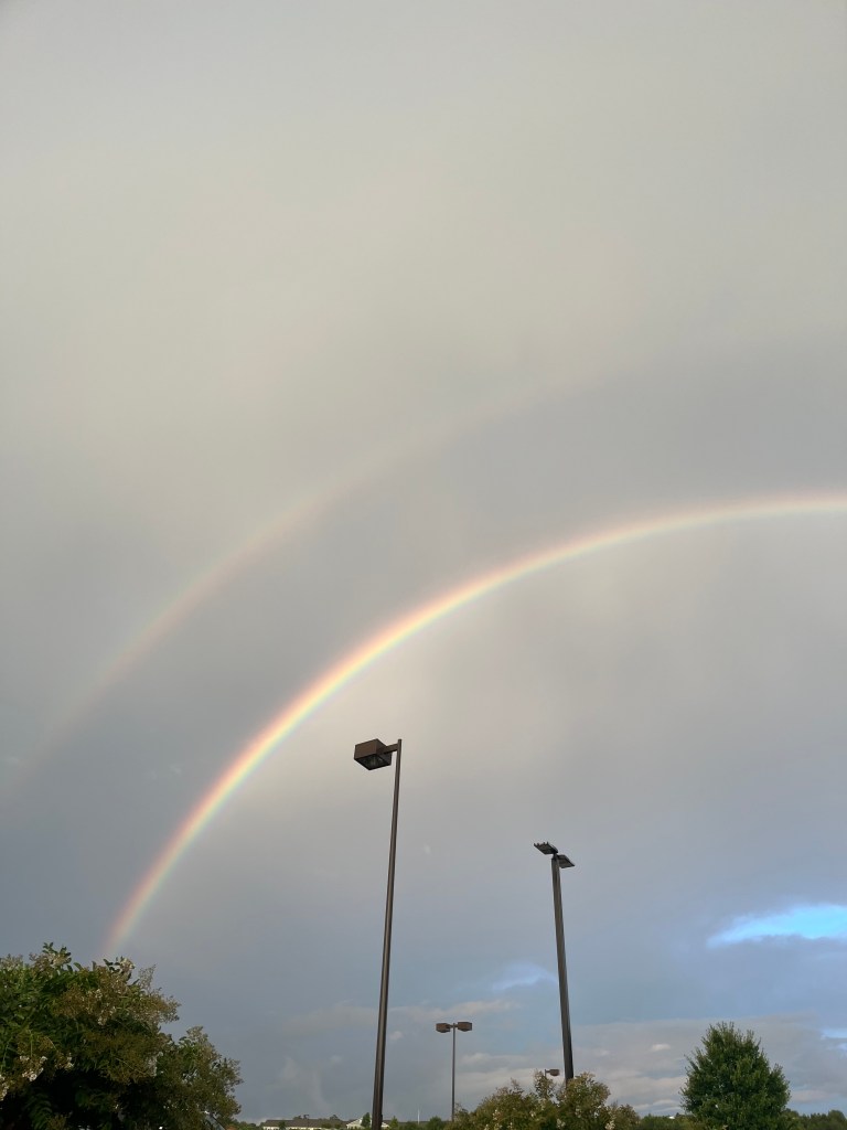 A rainbow I photographed outside my workplace.My girlfriend and I on a hike.A sunset photographed by my girlfriend.A photo of me taken at my high school graduation.